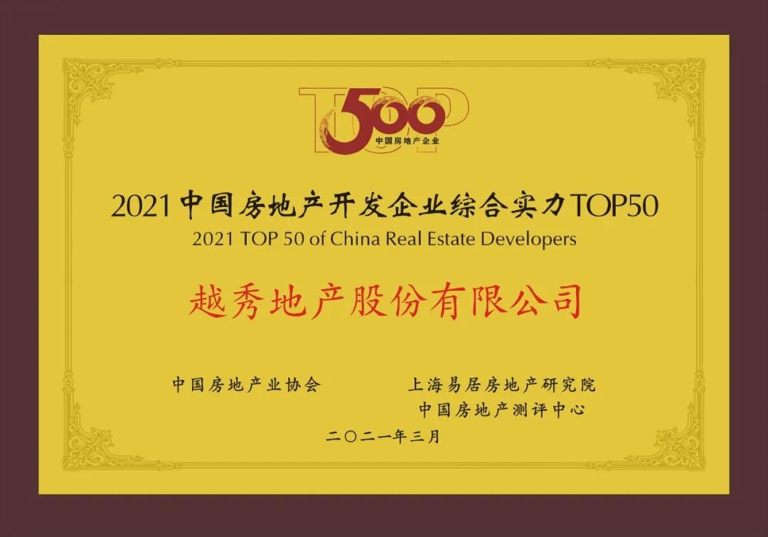 此次越秀地产获得 “2021中国房地产开发企业综合实力TOP50”、