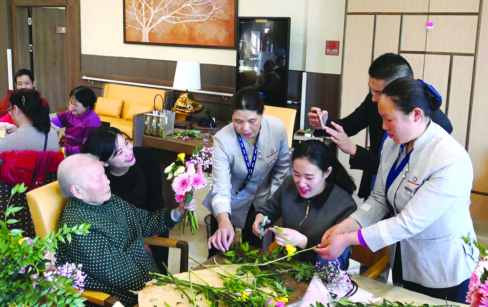Elderly people attend a flower arranging class that was organized by a China-France joint venture senior care center. [Photo provided to China Daily]