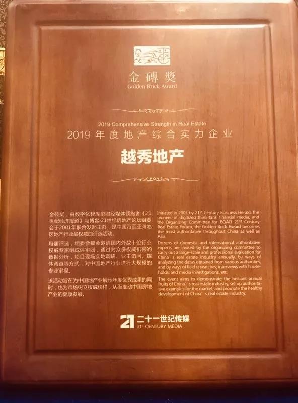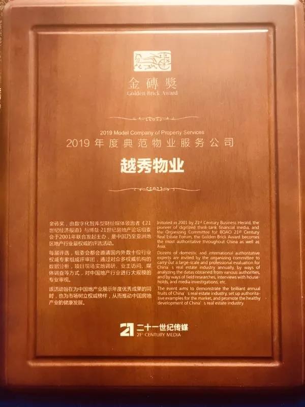 From July 26 to 29, 2019, the 19th Annual Conference of Boao 21st Century Real Estate Forum was held in Sanya, Hainan. In the award ceremony of the 19th Golden Brick Award for Real Estate of China, held during the above said period, Yuexiu Property won the Golden Brick Award for Real Estate of China-the real estate enterprise with the greatest comprehensive strength of 2019 and the Golden Brick Award for Real Estate of China-the property management service model company of 2019.